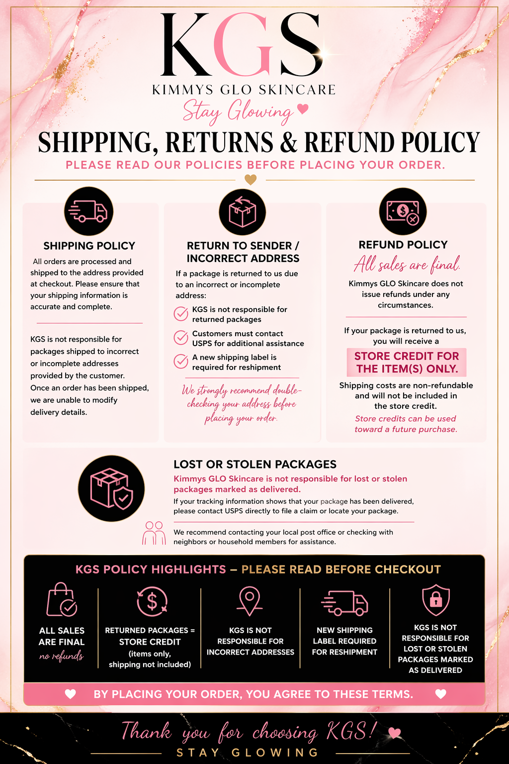 At Kimmys GLO Skincare (KGS), we are committed to delivering your glow with care and transparency. Please review our policies before placing your order.